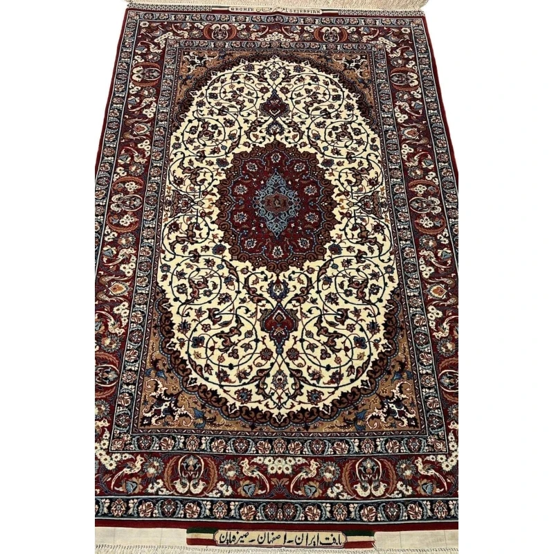 Experience the magnificence of Persian craftsmanship with this hand-knotted Isfahan Persian rug, an exclusive creation by Master Bagher Seirafian, a legendary name in Persian rug weaving. This stunning piece features an intricately detailed floral medallion, gracefully set within an ivory background, adorned with delicate vines, arabesques, and floral motifs. The elegant burgundy and navy border, enriched with traditional Persian elements, enhances the artistic beauty of this masterpiece.